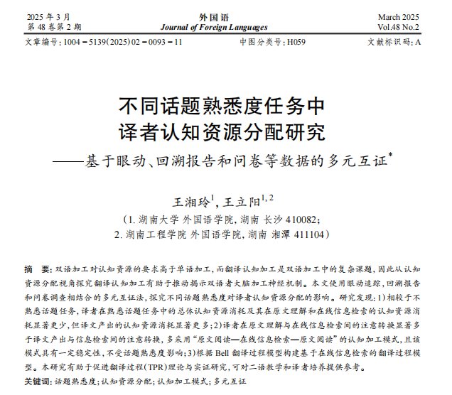 王湘玲、王立阳在《外国语》发文:不同话题熟悉度任务中译者...